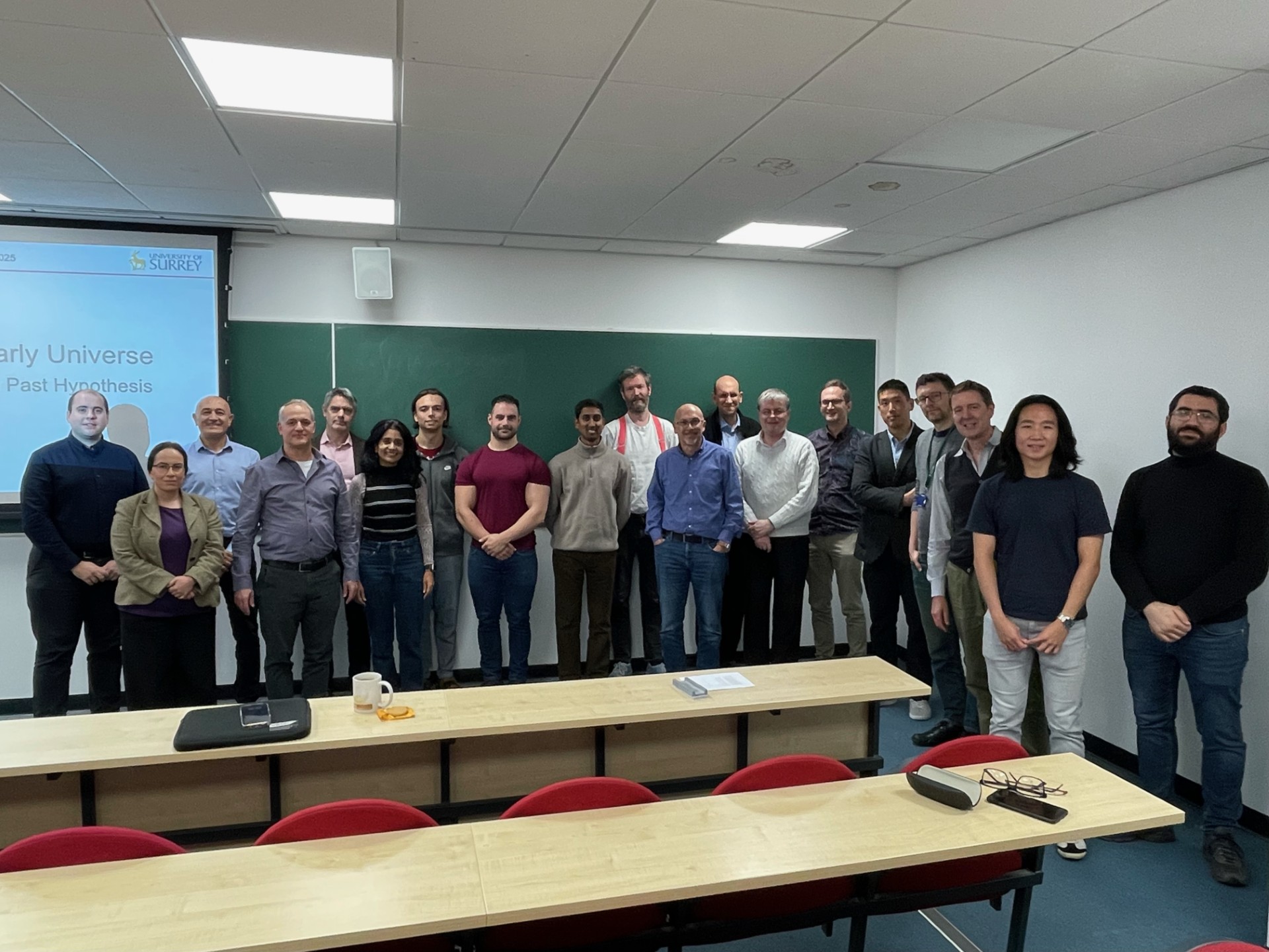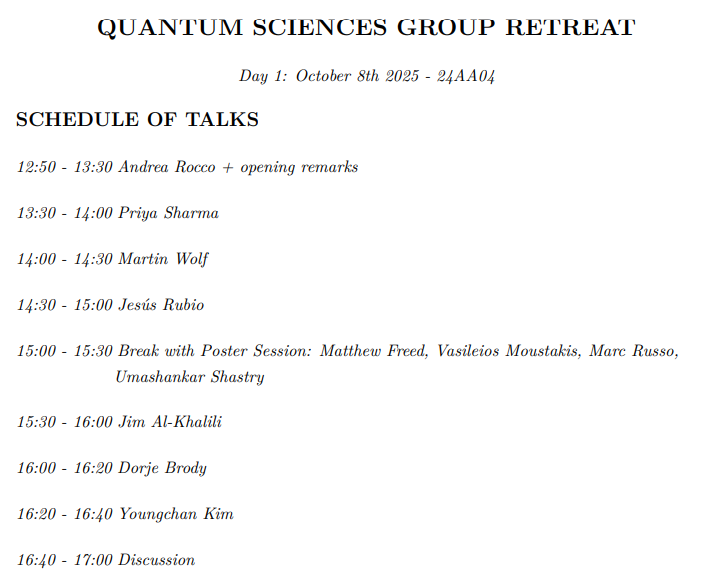 On Wednesday 8th October a one-day meeting on Quantum Sciences Research was hosted by the School of Mathematics and Physics and organised by Andrea Rocco and Alessandro Torrielli. The idea was to get members of the Quantum Sciences Group to speak about their latest research, and to invite others in the School whose research contains a quantum component. Speakers on the day were Andrea Rocco, Priya Sharma, Martin Wolf, Jesús Rubio, Jim Al-Khalili, Dorje Brody, and Youngchan Kim. The PhD students were invited to present posters (which now hang in the corridor). The group photo from the event is shown below (click on image to enlarge), and a screenshot of the timetable is shown below that. Part II will be held next Wednesday 15 October. Photo credit: Elizabeth Jones.