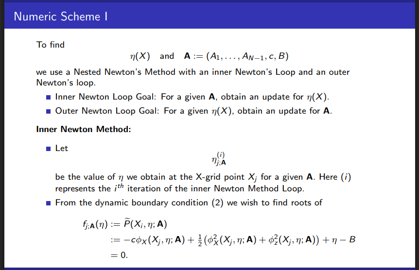 Congratulations to Anusha Amber Catherine Corlett Schutz for passing her PhD Confirmation viva! It was held on Wednesday 22 October, and her examiners were Werner Bauer and Bin Cheng. The title of her report is “Breaking water waves in a finite depth fluid”. Her project is funded by a Breaking Barriers Scholarship awarded by the Doctoral College. The project supervision team consists of Tom Bridges and Matt Turner. The image below is a screenshot of part of the numerical algorithm from her confirmation presentation.