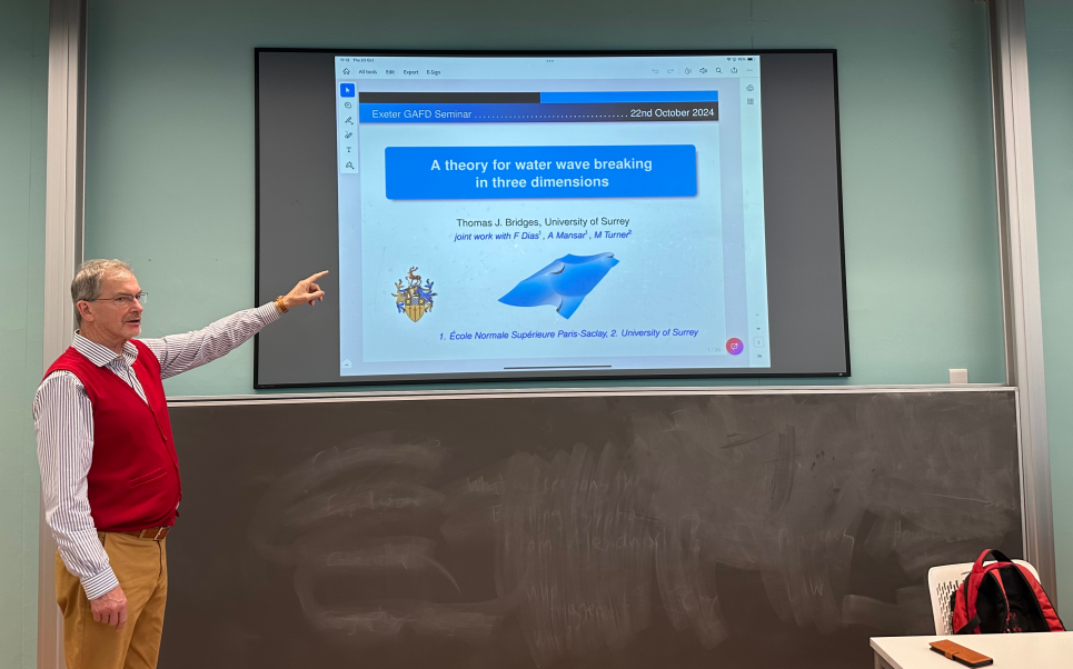 Tom Bridges visited the Department of Mathematics and Statistics at the University of Exeter last week (20-24 October). His host for the visit was Hamid Alemi Ardakani (former PhD student and Postdoc at Surrey, now Senior Lecturer in Mathematics at Exeter) The visit involved research interaction and meeting with members of the department. On the Wednesday 22 October, Tom gave a talk in the GAFD Seminar series on “A theory for water wave breaking in three dimensions” (notice and abstract at GAFD Seminar page). The photo below shows Tom at the talk.