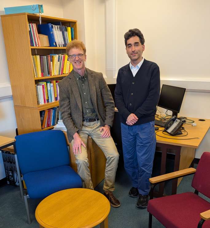 This week (29-30 October) Hamid Alemi Ardakani (Exeter) and Onno Bokhove (Leeds) visited Mathematics for research interaction as part of the Newton Institute funded wave energy network. Their host for the visit was Matt Turner with Tom Bridges joining the discussions. The discussions involved constructing a research plan and funding strategy for the next generation ocean wave energy harvesting devices. The photo below shows Onno (left) and Hamid (right) during their visit.