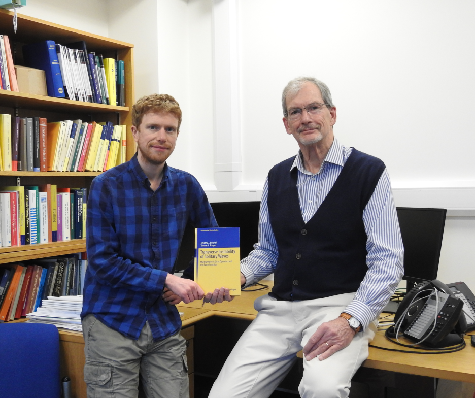 The monograph with title “Transverse Instability of Solitary Waves” and subtitle “Multisymplectic Dirac Operators and the Evans Function“, and authors Timothy Burchell and Tom Bridges, has been published by Springer Nature in December 2025 (publisher website here). It has 164 pages, introduces a new class of Hamiltonian PDEs in 2+1 dimensions, develops a theory for two-parameter Evans functions, and presents new results on the transverse instability of solitary waves. The photo below shows Timothy and Tom with a copy of the book fresh from the printing presses.