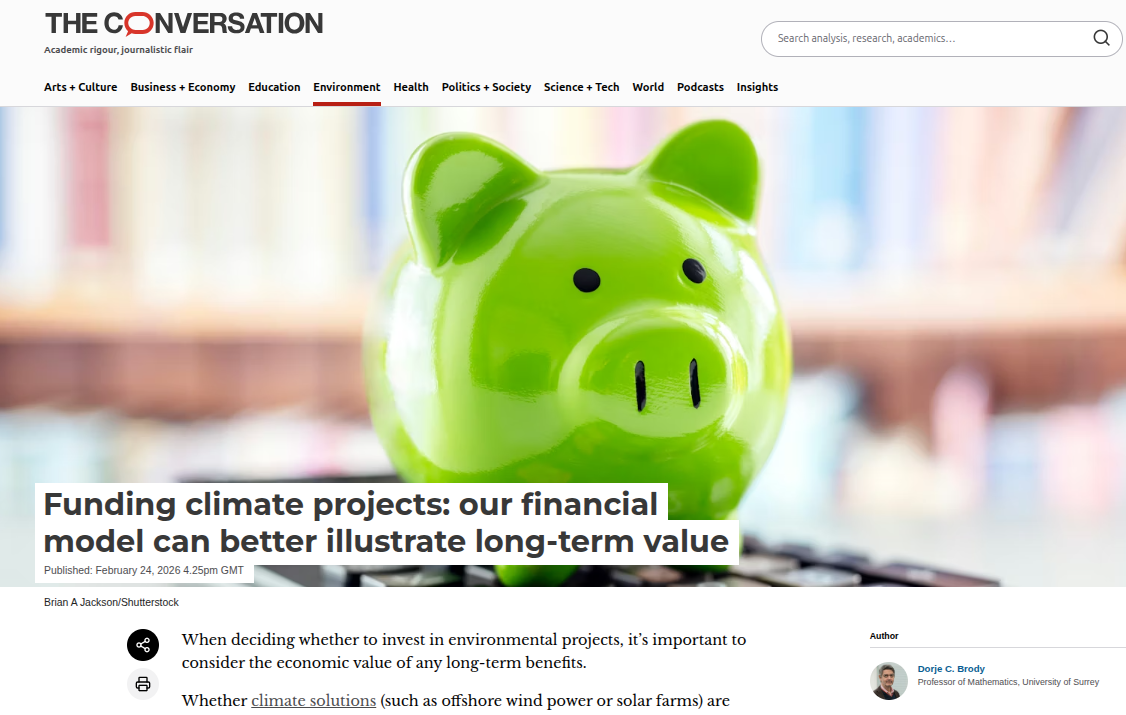 The article “Funding climate projects: our financial model can better illustrate long-term value“, by Dorje Brody, is published today (Tuesday 24 February) in The Conversation (link here). As a mathematician researching in finance, Dorje shows how to use a financial model called “social discounting” to value the long-term benefits of environmental projects far into the future. A perfectly consistent valuation method can be established using social discounting. The article goes on to give detail and examples. The screenshot below is from the front page of the article.