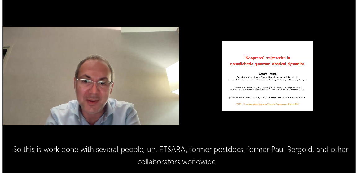 The Virtual International Seminar on Theoretical Advancements (VISTA) is an international virtual seminar series hosted by Professor Alexey V. Akimov at the University of Buffalo in the US. Cesare Tronci was a speaker in this series on 25 March, giving Seminar 105. The title of his talk was “Koopmon trajectories in nonadiabatic quantum-classical dynamics“. The video has just been made available and can be found here. The screenshot below shows Cesare at the beginning of his talk.